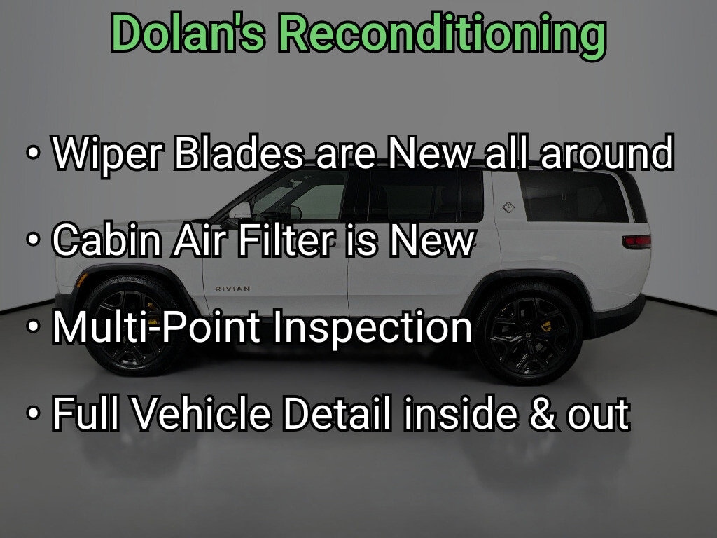 Wiper Blades are New all around, Cabin Air Filter is New, 19 Speakers, 3rd row seats: bench, 4-Wheel Disc Brakes, 7 Seat Interior, ABS brakes, Adaptive suspension, Air Conditioning, Alloy wheels, Audio memory, Auto High-beam Headlights, Auto tilt-away steering wheel, Auto-dimming door mirrors, Auto-dimming Rear-View mirror, Auto-leveling suspension, Automatic temperature control, Brake assist, Delay-off headlights, Driver door bin, Driver vanity mirror, Dual front impact airbags, Dual front side impact airbags, Electronic Stability Control, Emergency communication system, Exterior Parking Camera Rear, Four wheel independent suspension, Front anti-roll bar, Front Bucket Seats, Front Center Armrest, Front dual zone A/C, Front fog lights, Front reading lights, Fully automatic headlights, Heated & Ventilated Front Bucket Seats, Heated door mirrors, Heated front seats, Heated steering wheel, Illuminated entry, Knee airbag, Low tire pressure warning, Memory seat, Navigation System, Occupant sensing airbag, Outside temperature display, Overhead airbag, Panic alarm, Passenger door bin, Passenger vanity mirror, Perf Vegan Leather Seat Trim w/Patterned Stitching, Power door mirrors, Power driver seat, Power passenger seat, Power steering, Power windows, Radio: New Rivian Elevation Audio, Rain sensing wipers, Rear air conditioning, Rear anti-roll bar, Rear audio controls, Rear dual zone A/C, Rear fog lights, Rear reading lights, Rear seat center armrest, Rear window defroster, Rear window wiper, Remote keyless entry, Security system, Speed control, Speed-sensing steering, Split folding rear seat, Steering wheel memory, Steering wheel mounted audio controls, Telescoping steering wheel, Tilt steering wheel, Traction control, Trip computer, Turn signal indicator mirrors, Variably intermittent wipers, Ventilated front seats, Wheels: 21 Road Machined Aluminum, Multi-Point Inspection & Full Vehicle Detail inside & out.