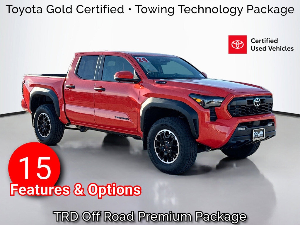 Multi-Point Inspection, w/Oil Change, Smog Completed, & Full Vehicle Detail Inside & Out, Wiper Blades are New all around, Cabin Air Filter is New, Engine Air Filter is New, 18" Alloy Wheels, 3.583 Axle Ratio, 3D Multi-Terrain Monitor, 4-Wheel Disc Brakes, 6 Speakers, 8-Way Power Driver & Passenger Seat Adjusters, ABS brakes, AC Power Inverter, Air Conditioning, Alloy wheels, AM/FM radio: SiriusXM, Anti-whiplash front head restraints, Apple CarPlay/Android Auto, Auto High-beam Headlights, Auto-Dimming Digital Display Rearview Mirror, Auto-dimming Rear-View mirror, Automatic temperature control, Brake assist, Bumpers: body-color, Digital Key Capability, Driver door bin, Driver vanity mirror, Dual front impact airbags, Dual front side impact airbags, Dual Zone Automatic Climate Control, Electronic Stability Control, Emergency communication system: Safety Connect (1-year trial), Exterior Parking Camera Rear, Fabric Seat Trim, Four wheel independent suspension, Front & Rear Parking Assist w/Automatic Braking, Front anti-roll bar, Front Bucket Seats, Front Center Armrest, Front fog lights, Front reading lights, Fully automatic headlights, Heated & Ventilated Front Seats, Heated door mirrors, Heated Leather-Trimmed Steering Wheel, Illuminated entry, Integrated Trailer Brake Controller, JBL Premium Audio, Knee airbag, Leather Shift Knob, Leather steering wheel, Low tire pressure warning, Navigation system: Drive Connect (1 year trial) includes Cloud Navigation with real time traffic and Google POI, Occupant sensing airbag, Outside temperature display, Overhead airbag, Overhead console, Panic alarm, Passenger door bin, Passenger vanity mirror, Pedestrian Detection, Power door mirrors, Power Horizontal Rear Window, Power steering, Power Tilt/Slide Moonroof w/Sliding Sunshade, Power windows, Pre-Wired Auxiliary Switches, Qi-Compatible Wireless Charging, Radio: 14" Toyota Audio Multimedia, Radio: 8" Toyota Audio Multimedia, Rear step bumper, Rear window defroster, Remote keyless entry, Security system, SofTex Seat Trim, Speed control, Speed-sensing steering, Split folding rear seat, Steering wheel mounted audio controls, Tachometer, TACOMA Stamped Power Open & Close Tailgate, Telescoping steering wheel, Tilt steering wheel, Towing Hitch, Towing Technology Package, Traction control, TRD Off Road Premium Package, Trip computer, Turn signal indicator mirrors, Variably intermittent wipers.
